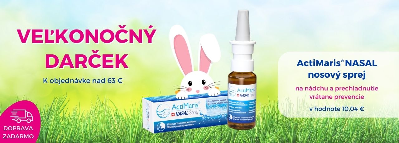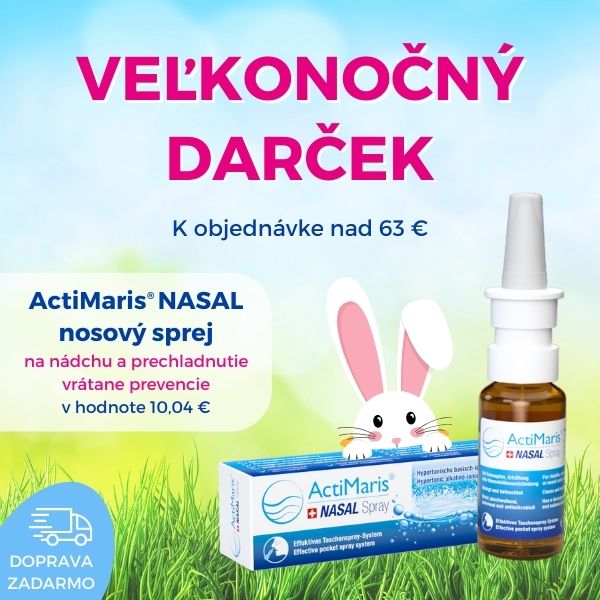 V prípade, ak máte v košíku produkty za viac ako 63 €, objaví sa Vám automaticky v pokladni (v pravom stĺpci) veľkonočný darček – ActiMaris® NASAL nosový sprej.